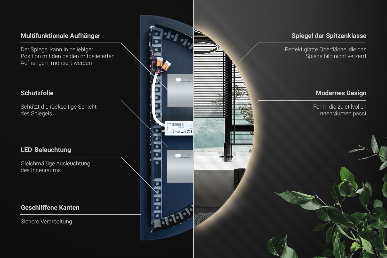 Erhältlich in sechs verschiedenen Größen – 25x50 cm, 30x60 cm, 35x70 cm, 40x80 cm, 45x90 cm und 50x100 cm – passt sich der halbrunde Spiegel mit LED-Beleuchtung flexibel jedem Raumkonzept an. Ob klein und dezent oder großzügig und präsent – für jeden Bedarf bietet sich die passende Variante. Die Kombination aus klarer Form, hochwertiger Verarbeitung und modernem Lichtdesign macht dieses Produkt zu einem Must-have für alle, die Wert auf stilvolle Wohnakzente legen.